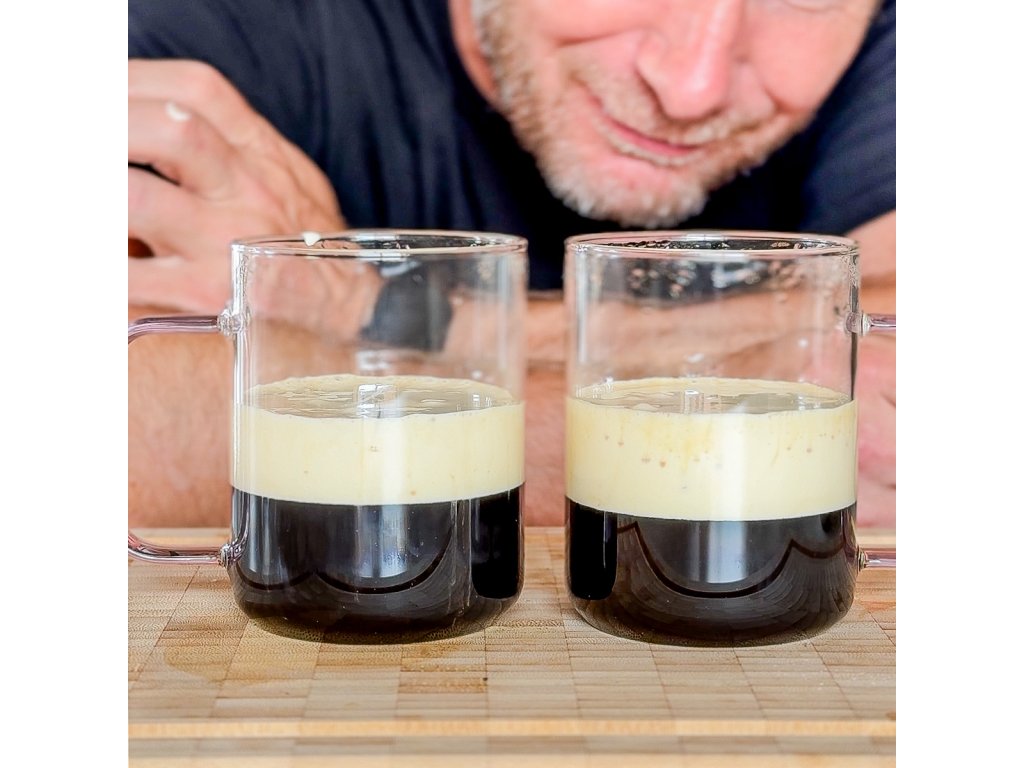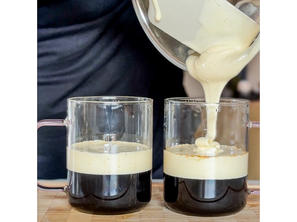 Horkou kávu pomalu nalijte do šálku s vaječnou pěnou