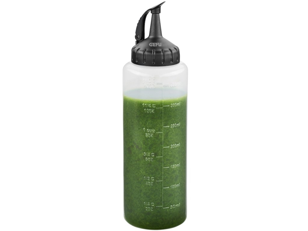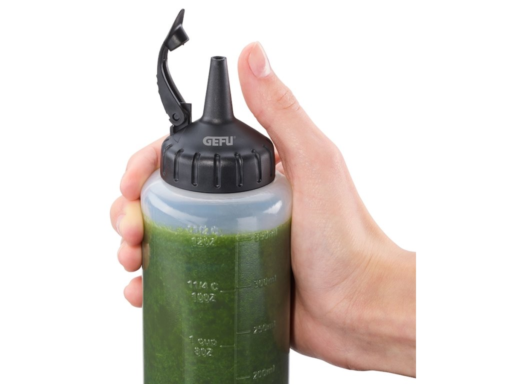 Je ideální pro jemné dávkování tekutin při pečení i vaření – kontroluješ množství tlakem, měříš díky stupnici v ml, uncích a cups, spolehlivé víčko udrží obsah dlouho čerstvý.