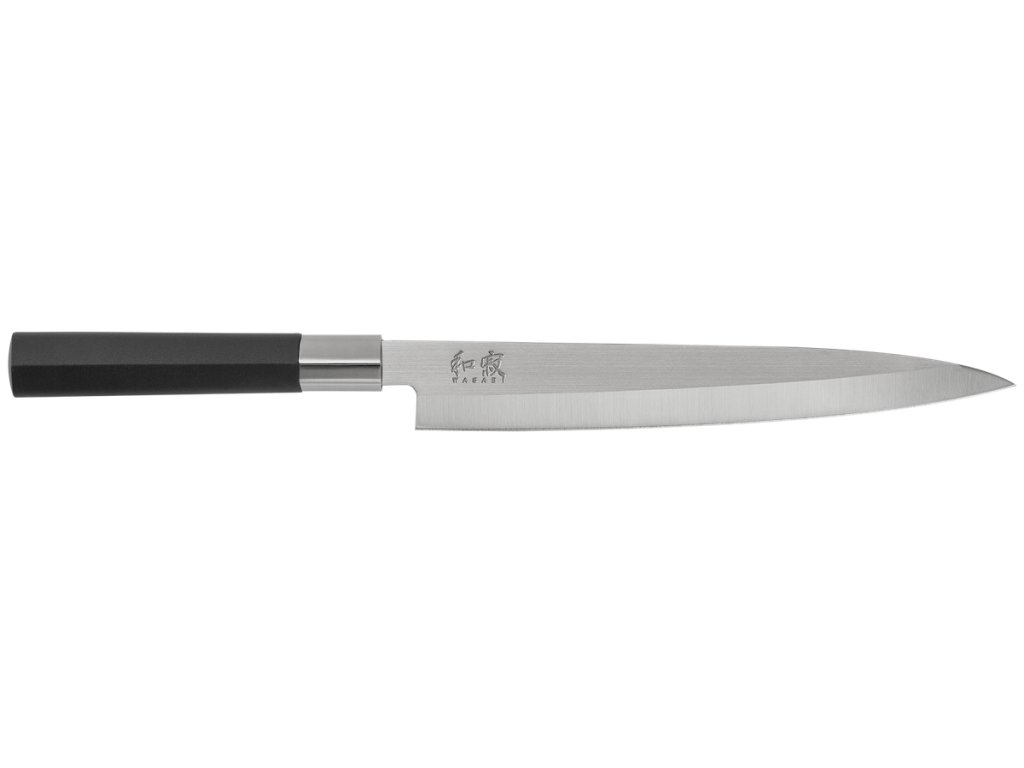 Yanagiba je tradiční japonský nůž s jednostranným broušením, ideální na krájení. Je to opravdu jediný správný nástroj, když chceš vytvořit tenké, dokonalé plátky syrové ryby pro sushi a sashimi. Klíčem je dlouhá čepel yanagiby a její extrémně ostré ostří. Při krájení s nožem Wasabi Yanagiba začni u zadní části čepele a jednoduše ho táhni přes rybu – nech, ať za tebe pracuje samotná váha čepele.