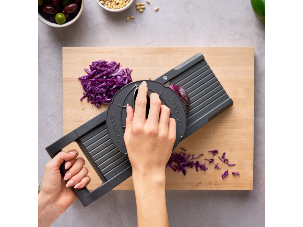 3. Pracuj opatrně – mandolína je opravdu ostrá! Vždy používej ochranný držák prstů