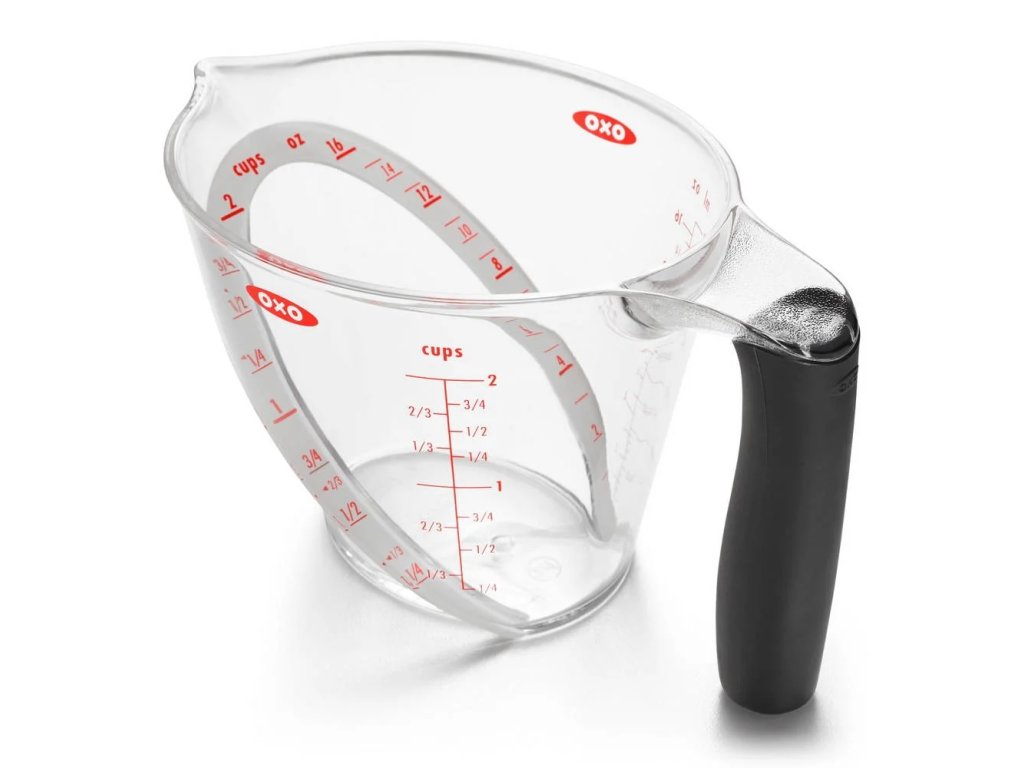 Patentovaný šikmý povrch vám umožní vidět značky měření shora při nalévání, takže můžete lépe měřit ingredience, aniž byste se museli ohýbat nebo zvedat odměrku do úrovně očí. Ergonomicky tvarovaná rukojeť má protiskluzové prvky, slévací zobáček umožňuje přesné přelévání tekutin bez kapek. Transparentní a velmi odolný plast tritan neobsahuje BPA a lze ho umývat v myčce.