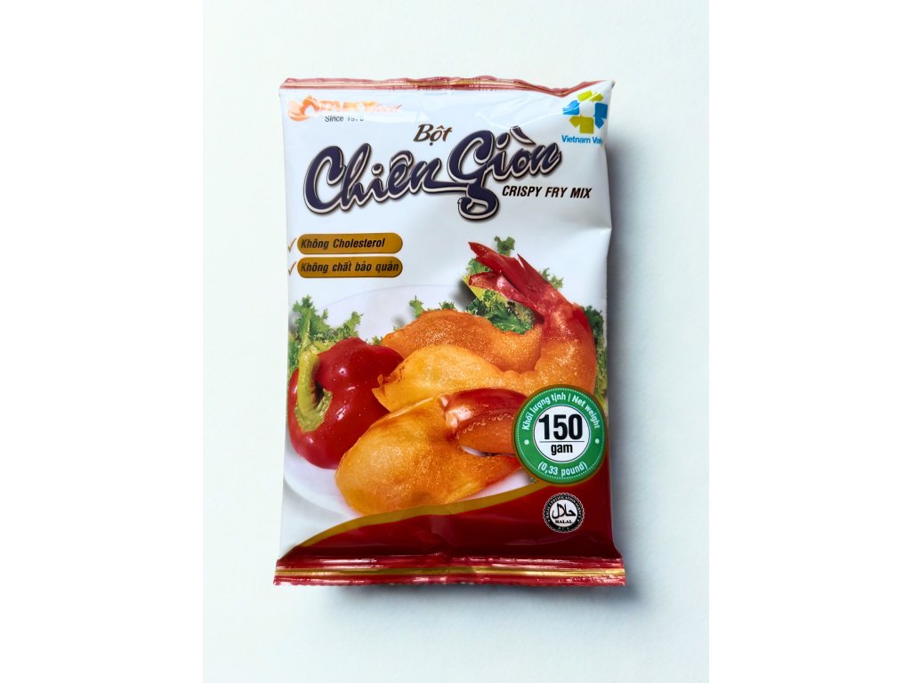 150 g směsi + cca 160 ml studené vody. Obalit maso, smažit na 170–180 °C 3–5 minut. Hotovo. Křupavé i po pár minutách na talíři.